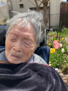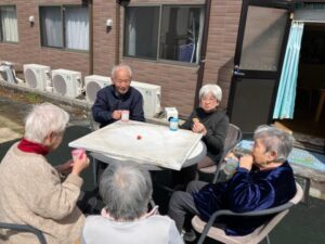「外で飲むといつもの飲み物も美味しく感じるね。」「風が気持ちいいねぇ。」「太陽にもあたって、お花も見れて極楽やねぇ。」など、みなさま口々に言われていました☻