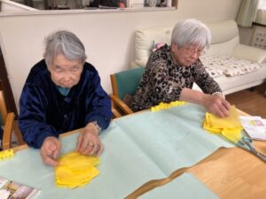 上の方の桜を作成させた後、黙々と黄色のお花紙での作業をされる皆さま。