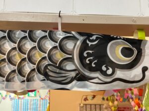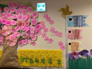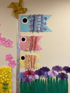 先日満開になった桜の掲示物のお隣にこいのぼりと菖蒲のお花が。