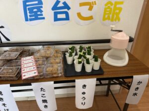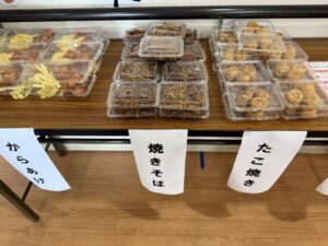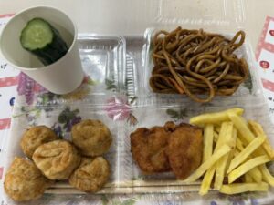 きゅうりの浅漬け、焼きそば、たこ焼き、からあげ、ポテト。ご飯。
