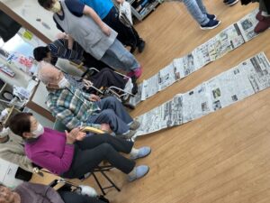 左右にわかれて、新聞引き寄せゲームです。