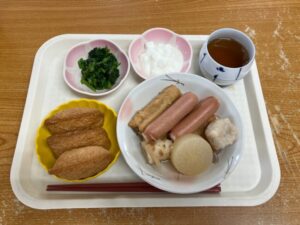 大根・ウインナー・ちくわ・ごぼ天や、菜っ葉のお浸し、マシュマロヨーグルト・いなり寿司を作りました。