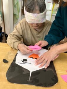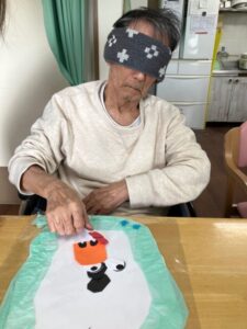 タオルで目を隠し、ご自身でおこなっていただきました。補助が必要な方は声を掛けながら