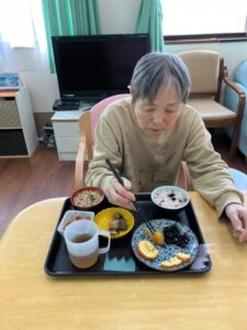 福笑いで遊んだ後は、おやつに和菓子を召し上がりました。