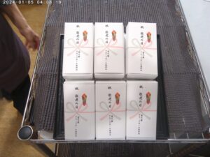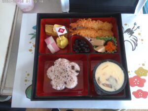 お昼を食べ終わった後はおやつに紅白饅頭が 出ましたお重の中に結構な量のご飯が入って おりましたが、お饅頭もぺろりと食べていました。