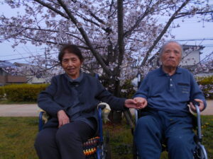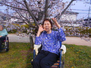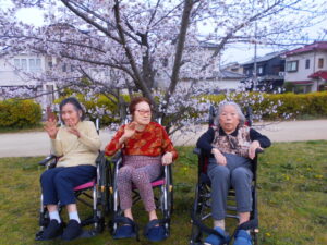 車椅子の方々も、スタッフと一緒に春風を感じながら、満開の桜を楽しまれました。 「外の空気は気持ちがいいね」と、皆様の会話も弾みます。