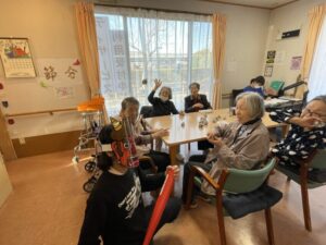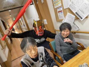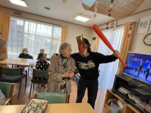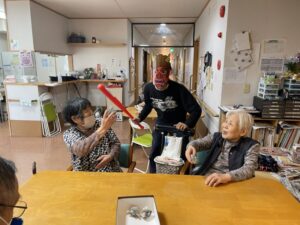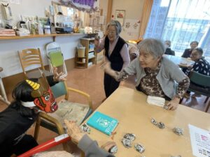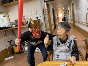 それまで静かにしていた入居者様も「これを鬼に向かってなげてください」と
