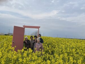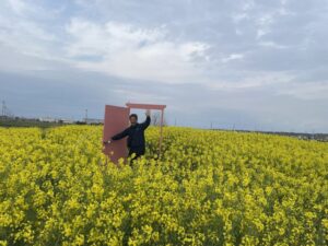 黄色の菜の花畑にピンクのドアがとても映えていました