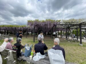 皆で藤を見ながら、お茶と苺が乘った洋菓子を