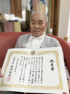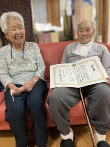 敬老の日に川越市から米寿のお祝いの賞状が届いたそうで、それをお持ちになってご主人様にお渡ししていました。