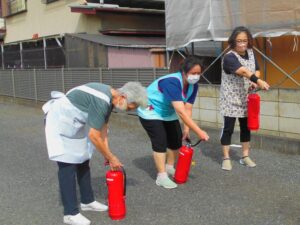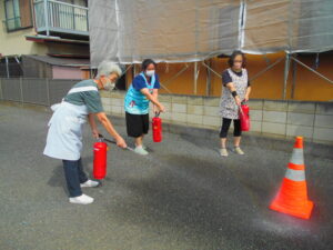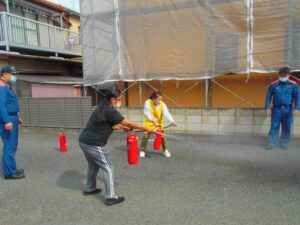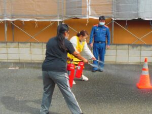 夜間想定の避難訓練の後は、消火訓練で消火器の使い方を教わります。