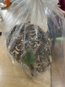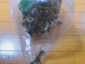 ビニール袋に入った巣からは、数匹スズメバチがウロウロしていて、思わず後ずさりです。