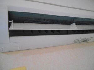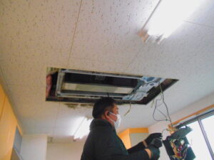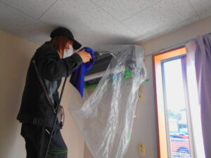 入居者様の頭上のエアコンの清掃は、ちょっとだけ入居者様に動いて頂きました。