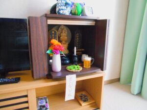本物そっくりのビールと枝豆のキャンドルがお供えされています。