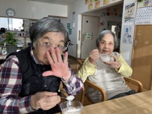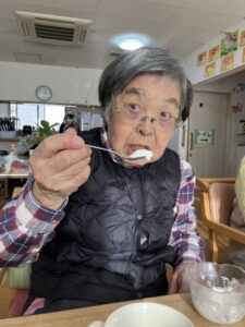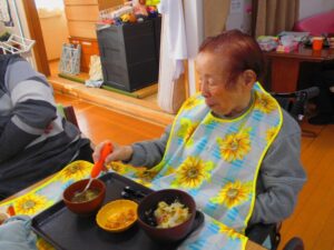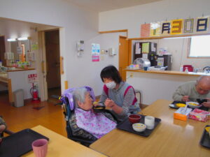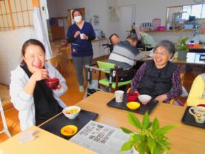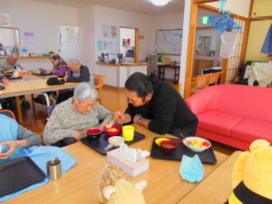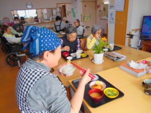 入居者様だけがただご飯を召し上がるのでは無く、スタッフが一緒に食べる事で会話が生まれ和やかな場になります。
