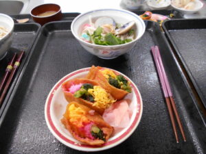 ちらし寿司を稲荷揚げに詰めて、お花の様に飾っていきます。