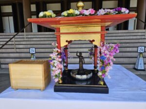 釈尊降誕会にて勤行が行われ、それに参加した後は花で飾られたお釈迦様に甘茶をひしゃくでそそいで祝い、無病息災を願います。