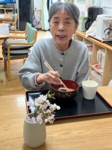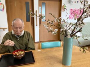 卓上の桜は、お留守番の入居者様を気遣った調理スタッフがお花屋さんで購入して