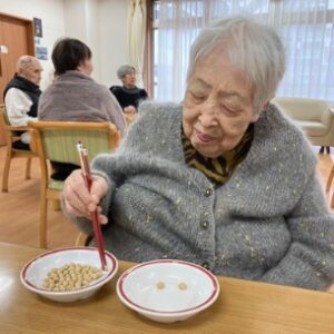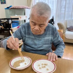 当ホームでは、豆まきはもちろんですが豆を使ったゲームを行いました!!