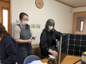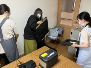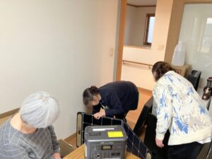 施設で備蓄している、ポータブル充電器の使用方法やソーラーパネルの使い方を