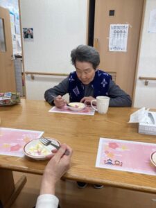 三室にも多くの女性の入居者様がいらっしゃいます。もちろん男性の入居者様の健康と幸せも皆さんで祈りながら、歌を歌い、ひな祭り特別メニューのお菓子を召し上がりました。