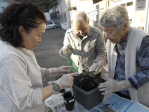 手袋を着け、プランターに土を入れながら