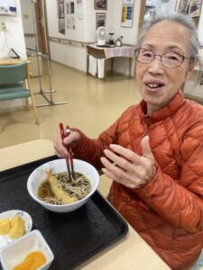 こちらは、1階のY様と2階のO様。「海老天もあってうまいね」と、いつにもまして食が進んでいました。
