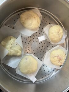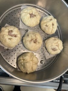 無事包めた肉まんを、蒸し器に入れて
