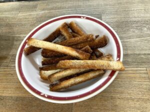 平たくしたパンに煮詰めたりんご、クリームチーズ、シナモンシュガーを乗せて丸めたら、