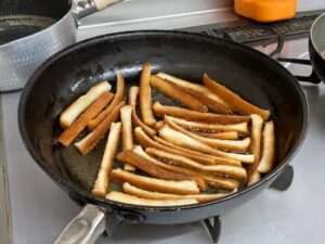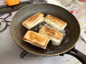 そして、耳を落としたパンをラップに包んで平たく押しつぶします。