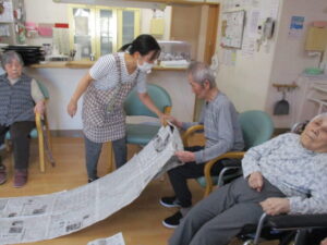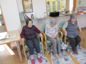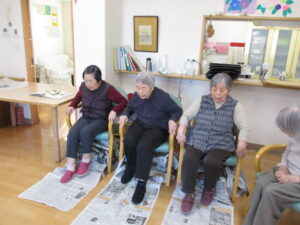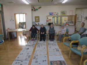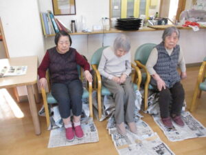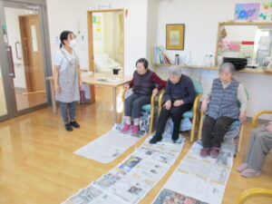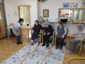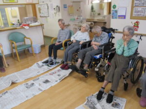 足で新聞引き寄せ競争!です