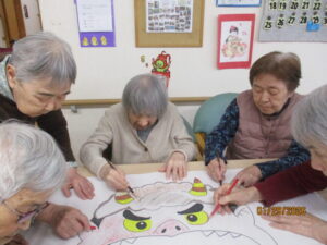 1階と2階の入居者様が協力して丁寧に色塗り
