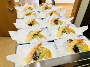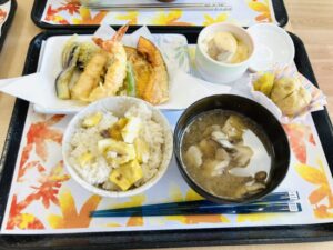 今回ご用意いたしましたのは、栗ご飯、舞茸豚汁、天ぷら盛り合わせ、茶わん蒸しです✨