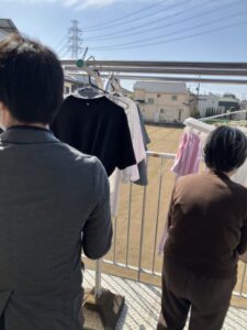 洗濯物を取り込む時間になったので、利用者様に「少しお手伝いをお願いできませんか?」とお声がけしてみたところ、二つ返事で快く手伝ってくださいました!
