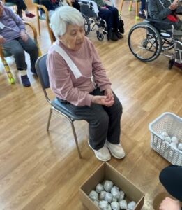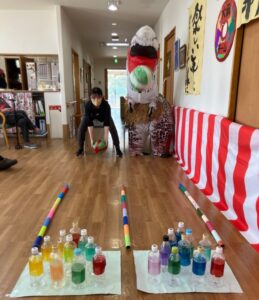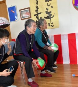 福笑いの次は玉投げ