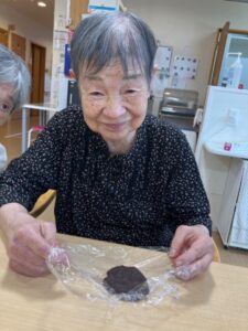 ②ラップの上にあんこをおいてその上につぶしたご飯をおいて丸める