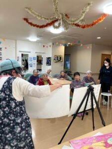 ボランティアの方が手書きで書かれた紙芝居はクオリティーが高く、参加した入居者様は食い入るように見てました。