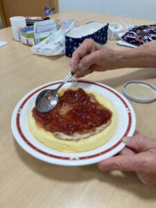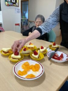 ケーキの土台は市販のものを使い入居者様が一生懸命ジャムを塗ったりトッピングされました✨