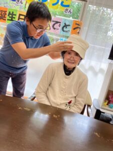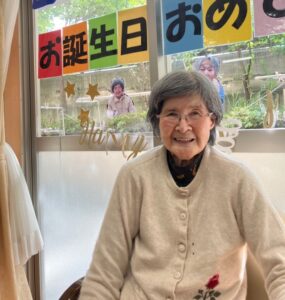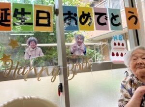 まず「お誕生日おめでとう」の飾り付けを行い満面の笑顔をいただきました!