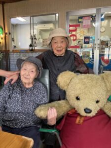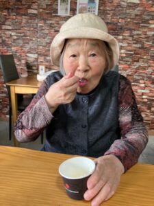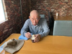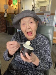 カメラを向けると、アイスを持った利用者さまが スプーンをこちらに差し出して「あ〜ん💕」のポーズ📸🍦✨ そのおちゃめな笑顔にスタッフみんなニッコリ☺️💓