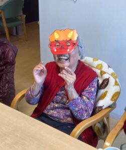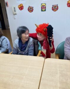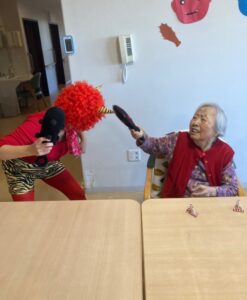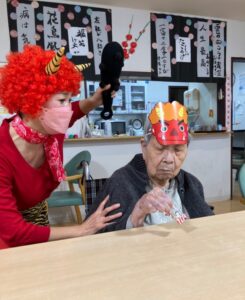 「鬼は外~」と豆を投げ退治するS様お二人👍