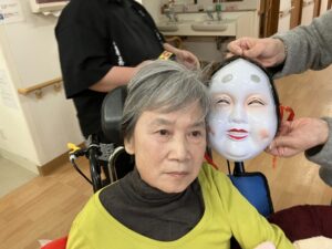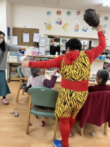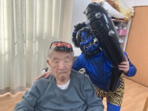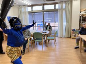 女の赤鬼と男の青鬼共に大暴れしていましたが、新聞紙のボール(大豆の代わり)を入居者様が投げたつけたことにより、無事退治されて、健康に安泰な年になる?と思います。