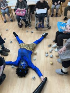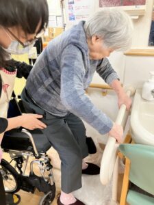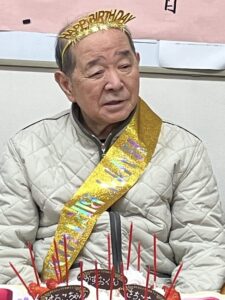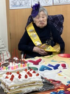 2階の誕生日会を2月25日に実施。主役は着飾り女性入居者様は口紅をして会に挑みました。
