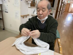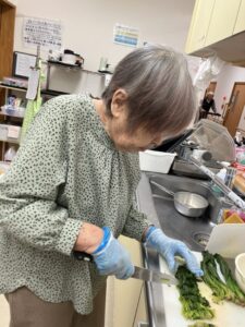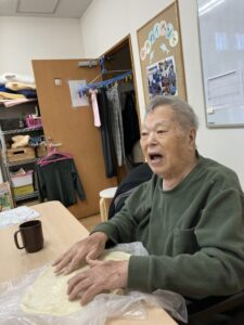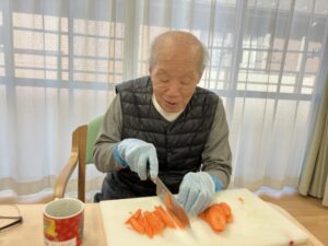 食材を切ったり、うどんの生地を踏んだり伸ばしたりと入居者様が真剣かつ笑顔でやって下さいました。
