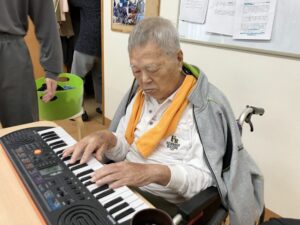 普段の様子としては、キーボードで曲を弾いたり、ぬりえを塗るのに集中したり、洗濯物をクリーニング顔負けなぐらい丁寧に畳んでくださったり、ホテルマンみたいに綺麗にテーブルを拭いたり、仮装したりと、日々を楽しまれています。