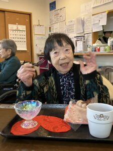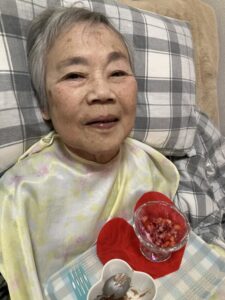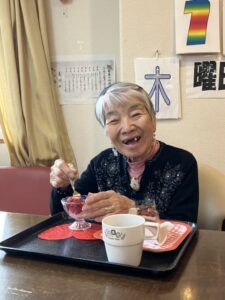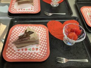 2月は右の利用者様の誕生月でした。バレンタインのイベントに合わせ、 綺麗なランチョンマットに乗せた