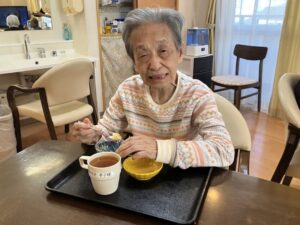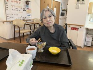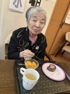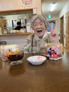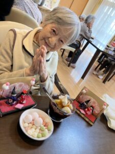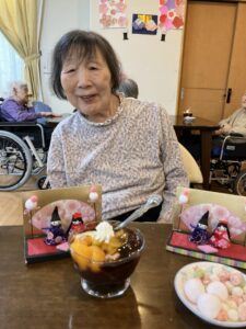 お雛様人形を横目に、ひなあられと和風デザートを召し上がっていただきました。