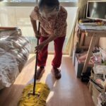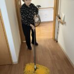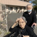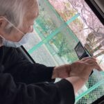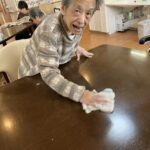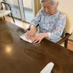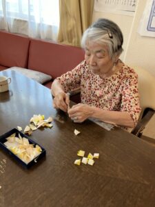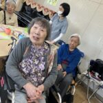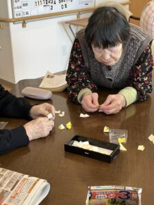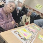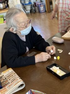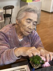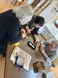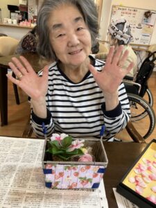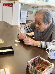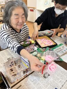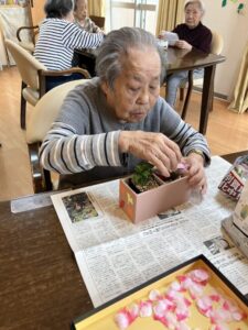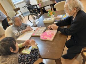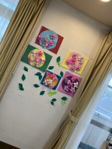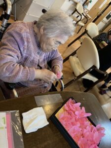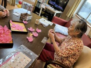 外に花見に出た後は、ホームの中を桜で彩るため、皆さんと一緒に工作を始めました。