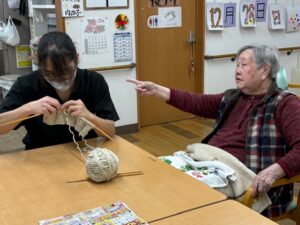 テーブルを囲み、毛糸と編み棒を手にすると、自然と会話も弾みます。「昔はよく編んだのよ」「ここはこうするんだよ」と、入居者さまと職員のやりとりがとても温かく、穏やかな時間が流れていました。