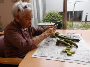頂いた新鮮なそら豆を102歳の入居者様にむいていただきました